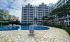 Ampla piscina coletiva e chuveirinho de praia;